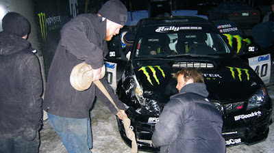 Still he pushed on and at the top of the hill drove quickly to their end of the clearing, turned the MG around and waited. The first MSV came flying into the cleaning and aimed itself at the sitting MG. Buzz grabbed reverse gear, backed up slightly to feint, stopped, and then backed up at full speed. The MSV, expecting the MG to change direction, veered the wrong way and slid to a stop up against a tree. Buzz was off again, down the fire tower road, and the undamaged MSV set off in pursuit. Buzz's predicament was unenviable. He was going full tilt down the twisting blacktop with a solid MSV coming up at him and an equally solid MSV coming down after him. On he went, however, braking hard before each turn and then accelerating back up to 45 in between. Coming down to a particularly tight turn, he saw the MSV coming around it from the other direction and stood on the brakes. In sheer desperation he pulled the handbrake as tightly as it would go and rammed the gear lever into 1st, popping the clutch as he did so. The back end locked solid and broke away, spinning him off the side of the road and miraculously into some bushes, which brought the car to a halt. As he was collecting his senses, Buzz saw the two MSVs, unable to stop in time, ram each other head on at over 40 mph.