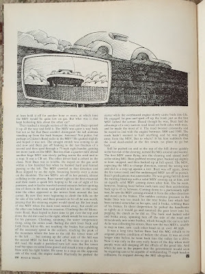 Buzz wasn't too worried yet. This had happened a few times before, and unless the MSV driver was an exceptionally good one, the MG could be called upon to elude the other driver without too much difficulty. Yet something bothered him about this gaudy MSV in his mirror, but what was it? Planning carefully, Buzz let the other driver catch up to within a dozen yards or so, and then suddenly shot off down a road to the right. The MSV driver stood on his brakes, skidding 400 feet down the road, made a lumbering U-turn and set off once again after the roadster. The MG had gained quarter mile in this manner and Buzz was thankful for the radial tires and front and rear anti-roll bars he had put on the car a few years back. He was flying along the twisting road--downshifting, cornering, accelerating and all the while planning his route ahead. He was confident that if he couldn't outrun the MSV then he could at least hold it off for another hour or more at which time the MSV would be quite low on gas. But what was it that kept bothering him about the other car?